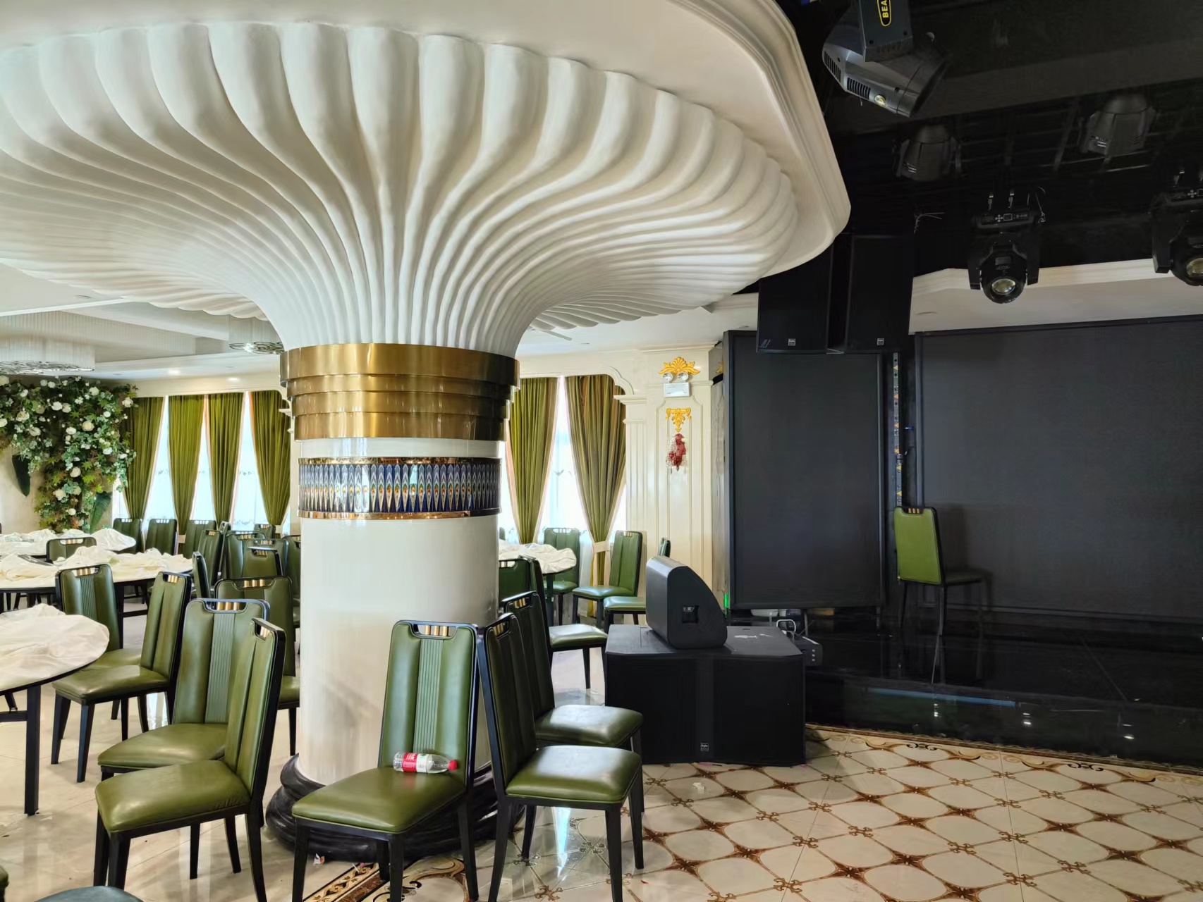 The banquet hall in Qitai County can be enjoyed with a gorgeous and comfortable environment, accompanied by beautiful and touching songs, making the consumers' dining mood more pleasant. The banquet hall adopts the Egle professional sound provided by Ruijian Electroacoustics International, presenting excellent sound effects.