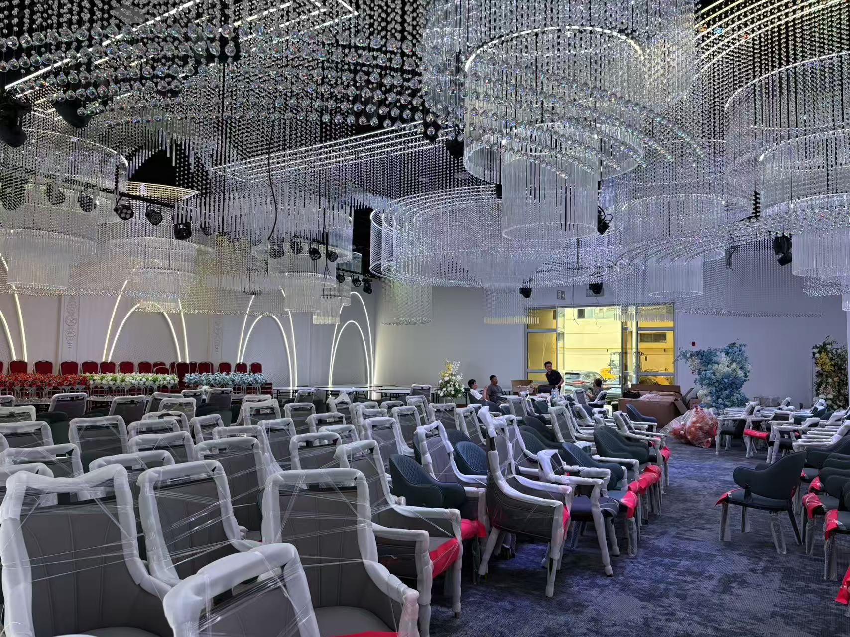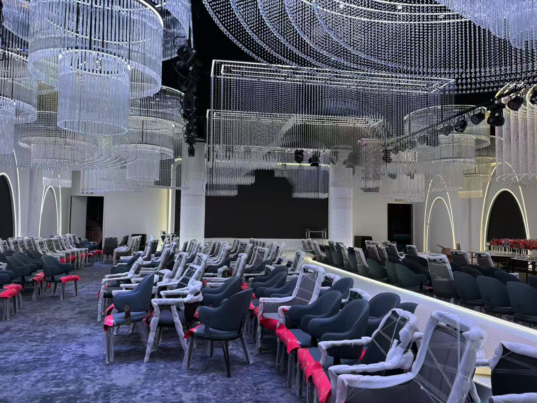 The Xin Hai Hotel Banquet Center is located in Tianshui City, Gansu Province. It features multiple banquet halls with different themes, and is decorated in a fashionable and luxurious style, exuding an air of grandeur. Each banquet hall is elaborately decorated, with magnificent crystal chandeliers hanging from the ceilings, casting a dreamy and colorful light from every angle. The elegant European-style tables and chairs, filled with flowers of various colors according to different themes, are perfectly complemented by exquisite vases. Between the guest seats on both sides, there is a transparent glass podium, which, when paired with different themes, highlights an extremely elegant atmosphere, exuding an air of nobility everywhere.