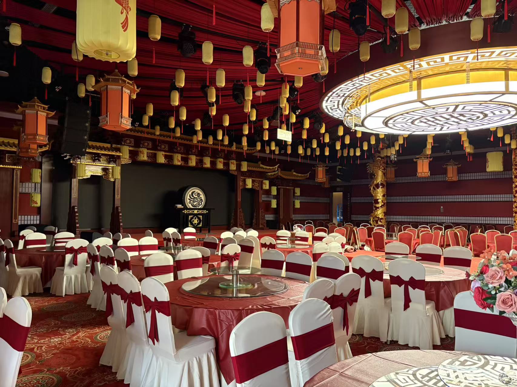 The banquet hall is equipped with a professional sound amplification system, advanced multimedia display system, rich stage lighting system, and intelligent centralized control system, providing excellent sound quality, clear picture display, and simple and convenient centralized control for wedding ceremonies, company dinners, large gatherings, various conferences, and small and medium-sized cultural performances.